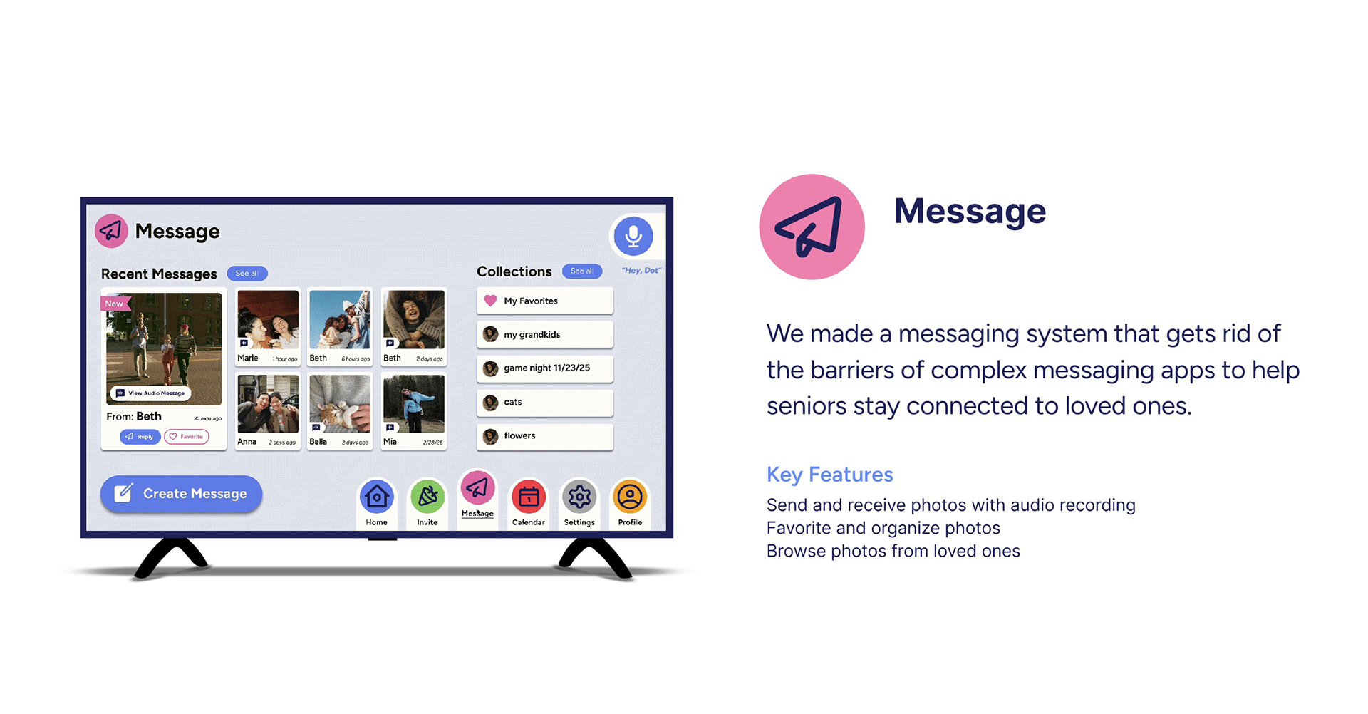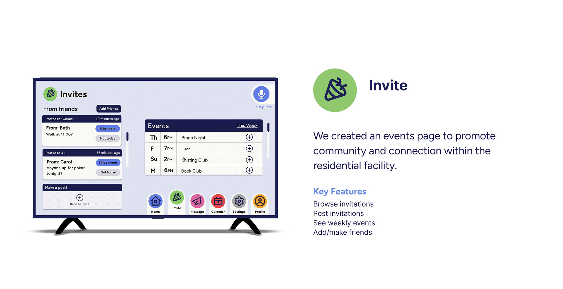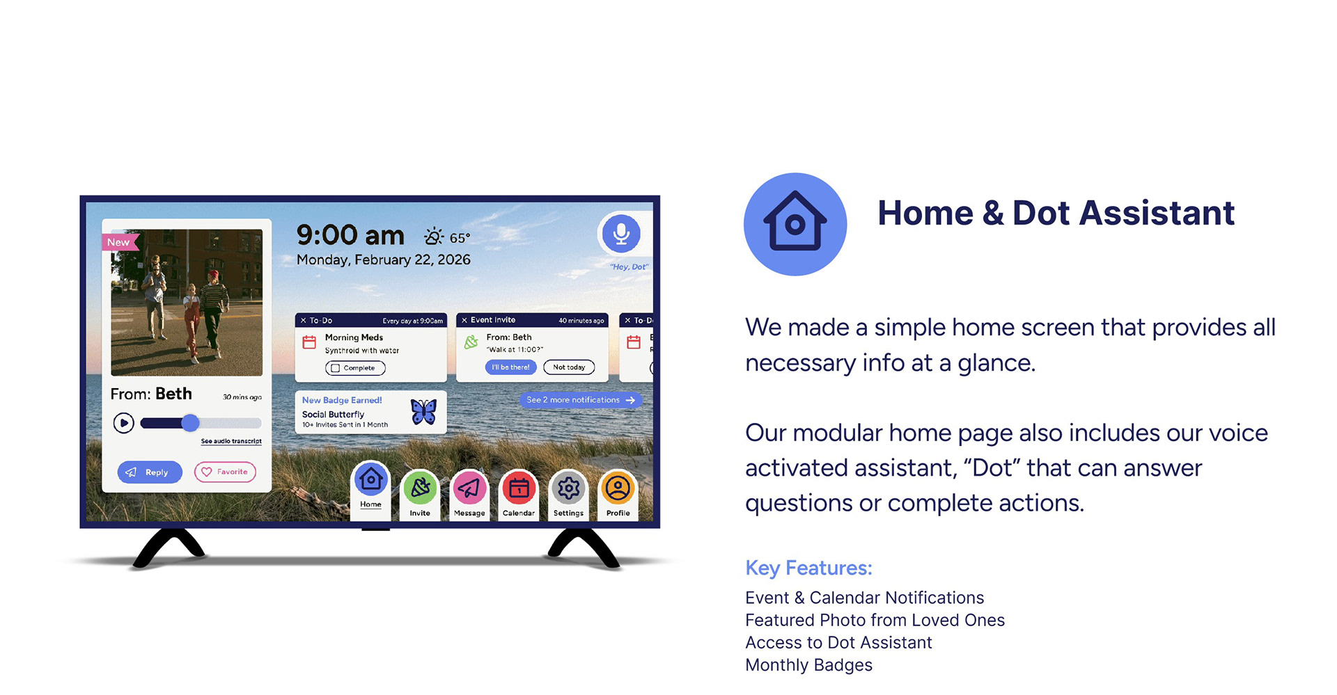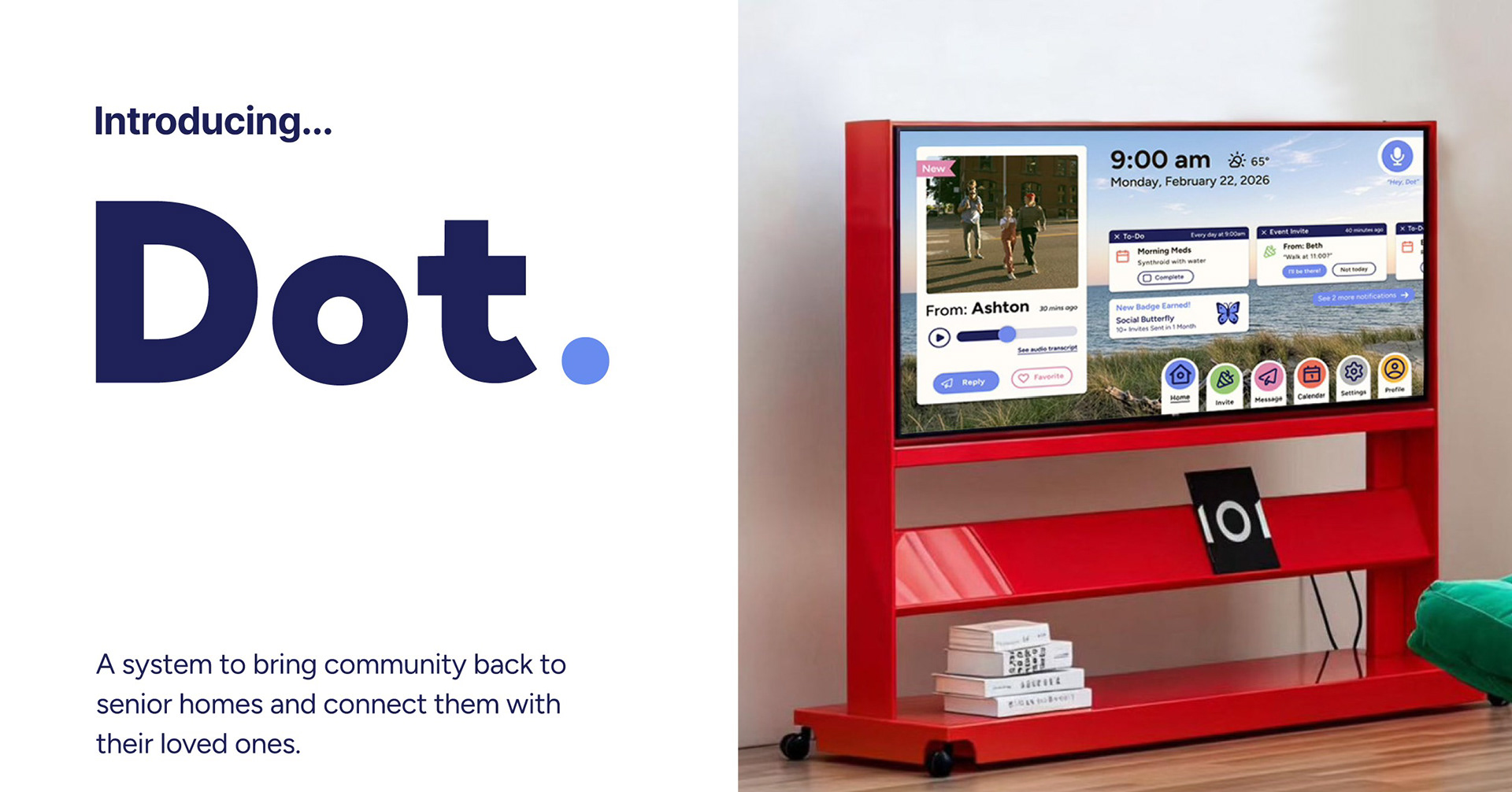 Dot is a community building device designed to be integrated into a brand new senior living home experience. Dot is a moveable, tv-sized, voice activated device that prioritizes accessability and connection, allowing residents to strengthen their community and stay connected with their loved ones.
